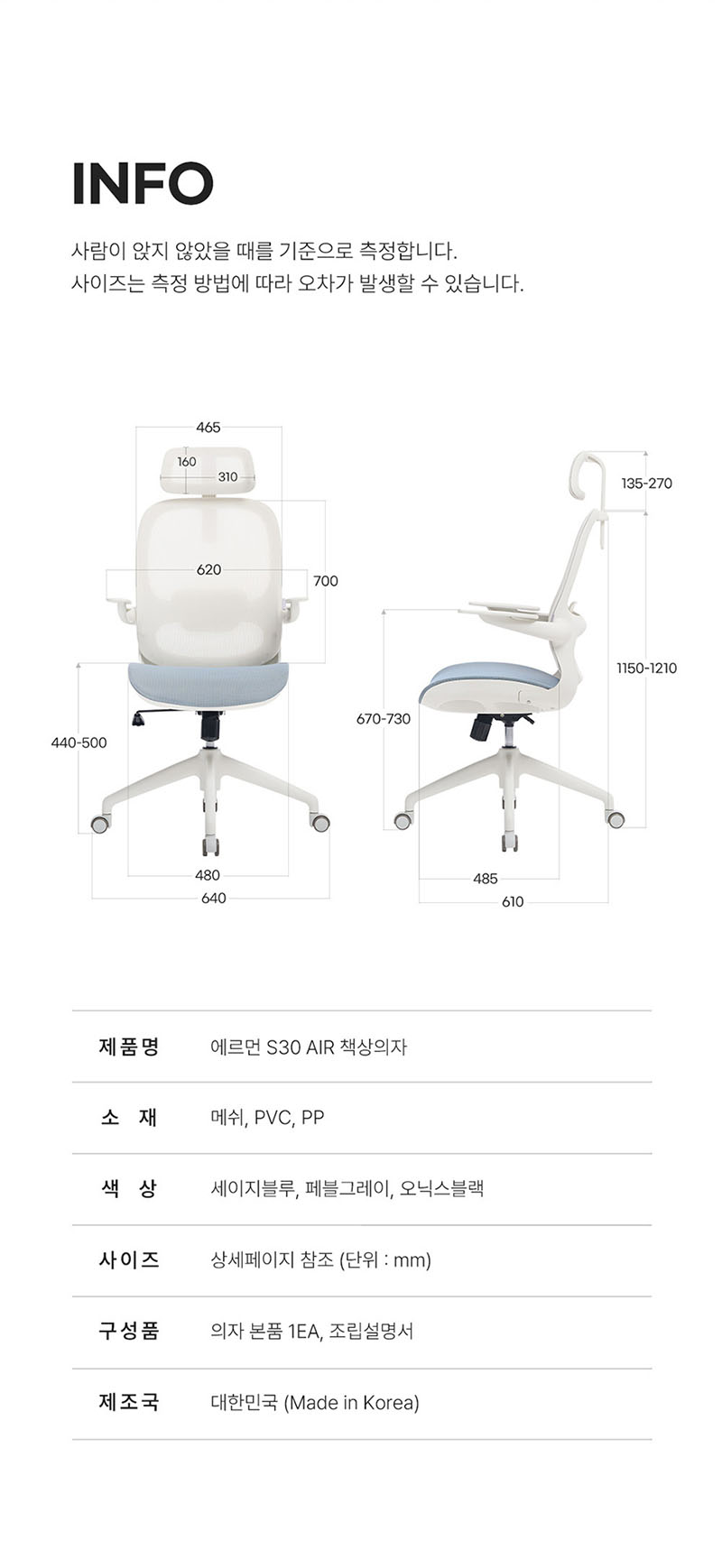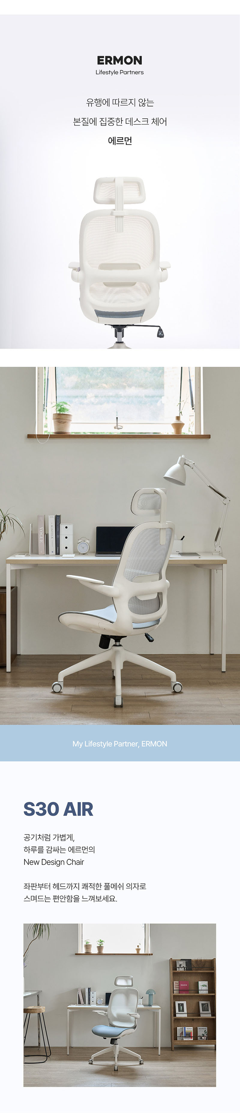[에르먼] S30 AIR 국내생산 풀메쉬 책상의자 사무용 사무실 학생 허리편한 컴퓨터의자